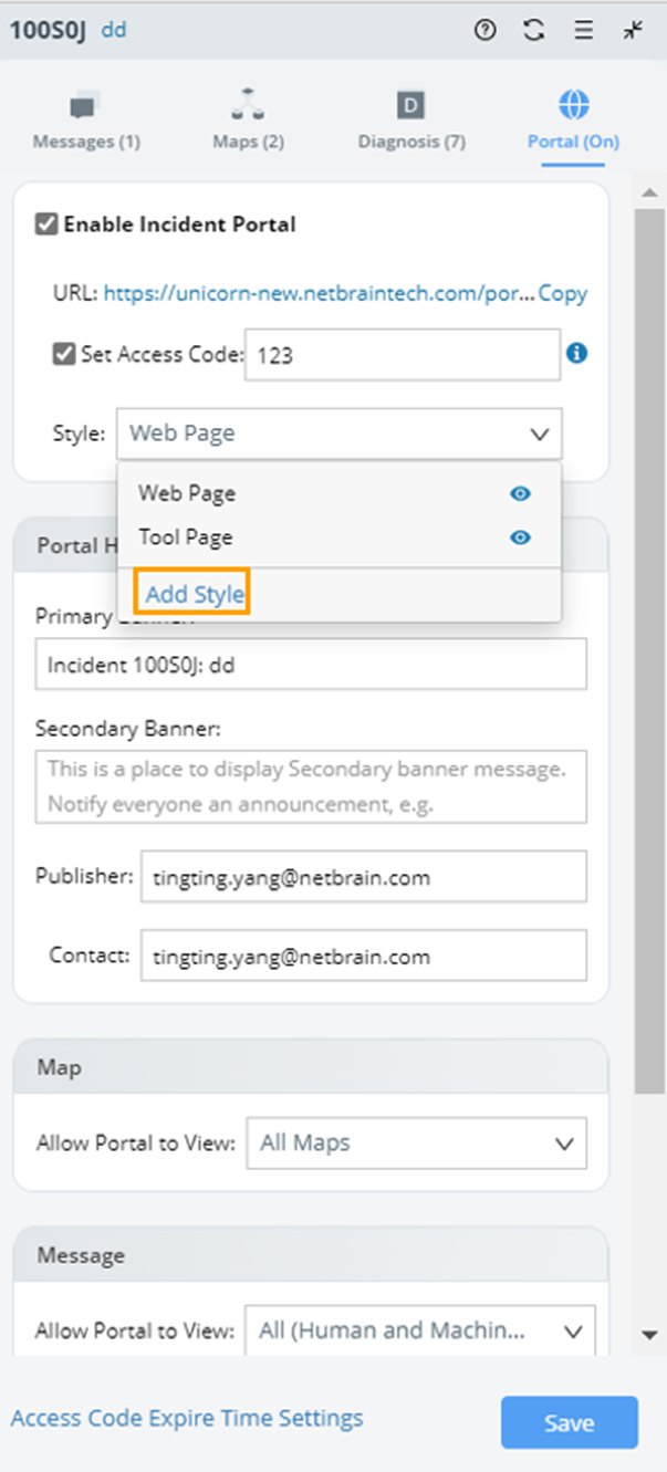 Portal styles can be selected in the Portal pane of a web incident. New portal styles can also be added.