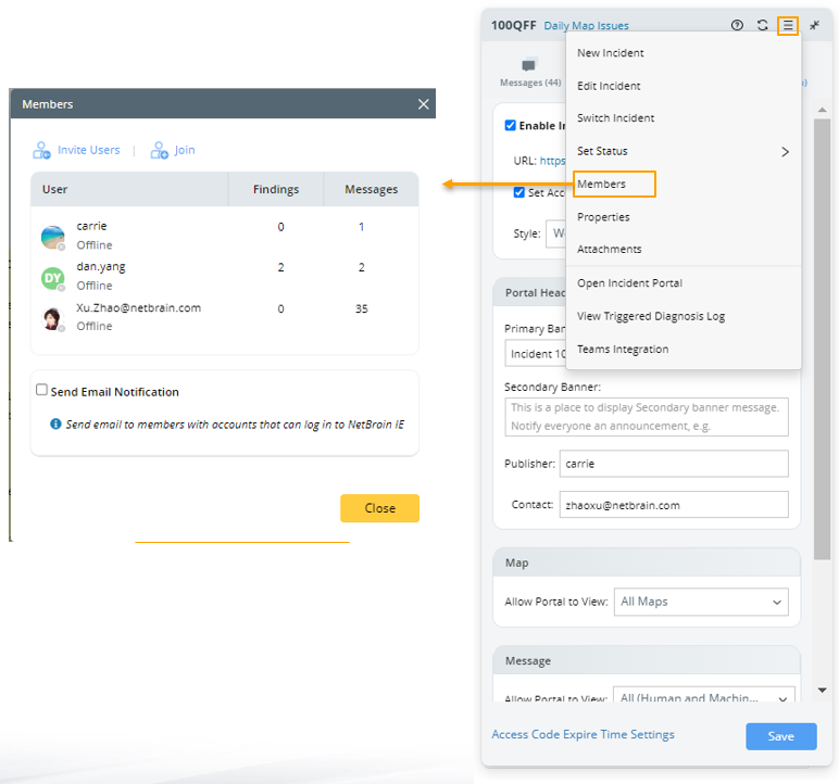 You can invite new members and view the status of other members from the drop-down list of the Hamburger menu. On the Members tab, the members engaged in the current Incident can be organized by inviting colleagues who are NetBrain users or external users to collaborate on the same task.