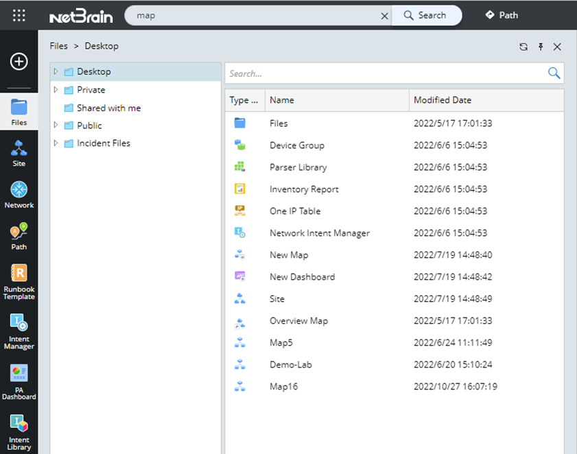 Tip: The files saved in the Private or Desktop category are only visible to yourself. To make a map file visible to all users in the domain, save it in the Public category. - Click OK. You can view the saved map file in the Files pane.