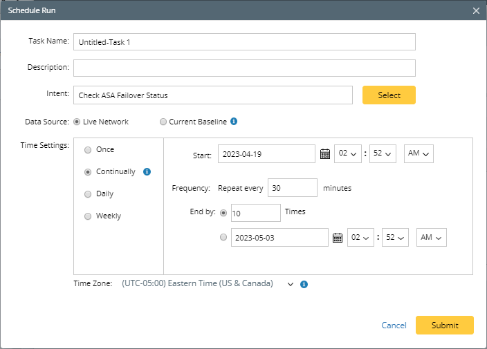 - Schedule the intent to run it periodically. See Settings for Creating a Scheduled Intent Task for more information.