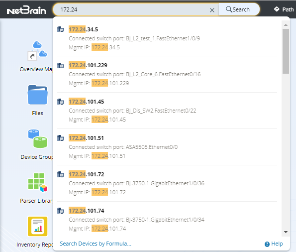 In NetBrain system, your entire network becomes a searchable database, and you can search for a device by using one of the following search terms: