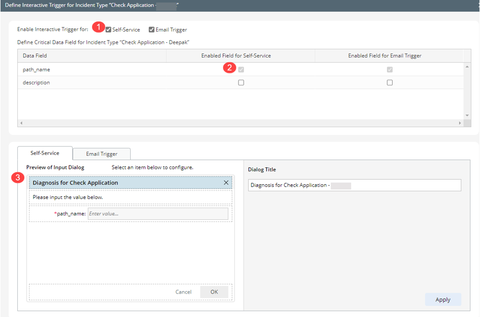 - In the Define Interactive Trigger for Incident Type window, enable the Self-Service checkbox.