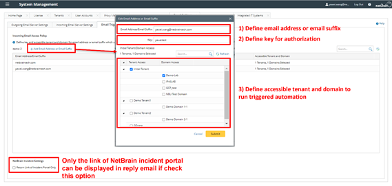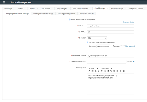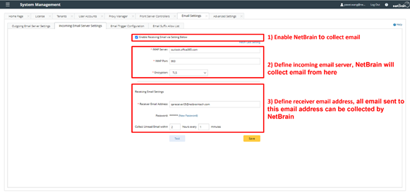 In the Email Settings tab in System Management, you can set up the receiver Email address for the NetBrain IE system: