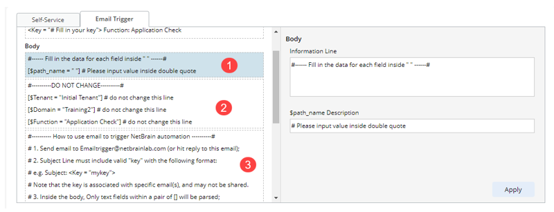 - Click each block of the email body and define the descriptions. Click Apply when one block is finished.