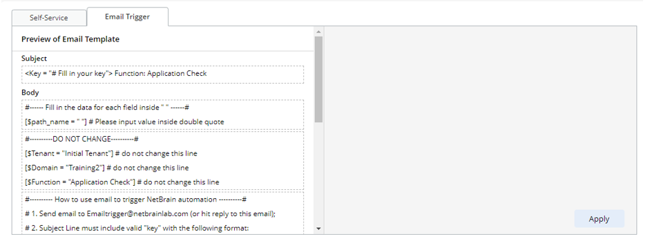 In the Email Trigger Configuration tab, you can add an Email Address or Email Suffix to define the allowed Email address for NetBrain. Three components need to be defined for each Email address:
