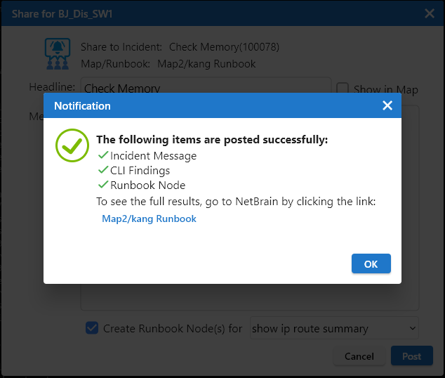 - Click Post. In the Notification dialog, click the created map/runbook link to switch to the IE system for your further operations.