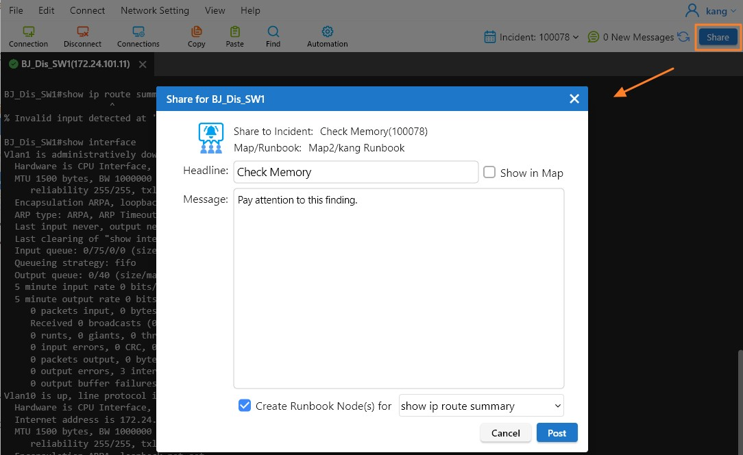 - Runbook CLI Node – created for the specified device and command output.