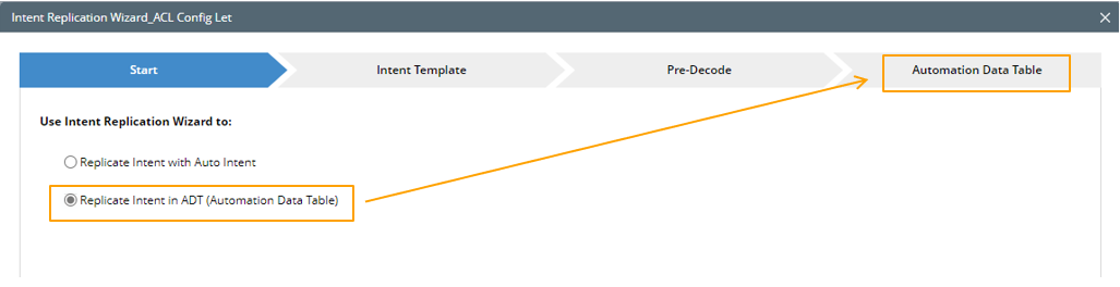 The Start tab of the intent replication wizard is the place where you get started and decide what to do via the wizard. You can select from the two options (Replicate intent via Auto Intent/ Replicate intent in ADT (Automation Data Table)).