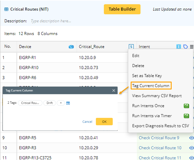 - Tag automation column: Open the Tag Current Column dialog from the drop-down menu of the target automation column, then enter the tags.
