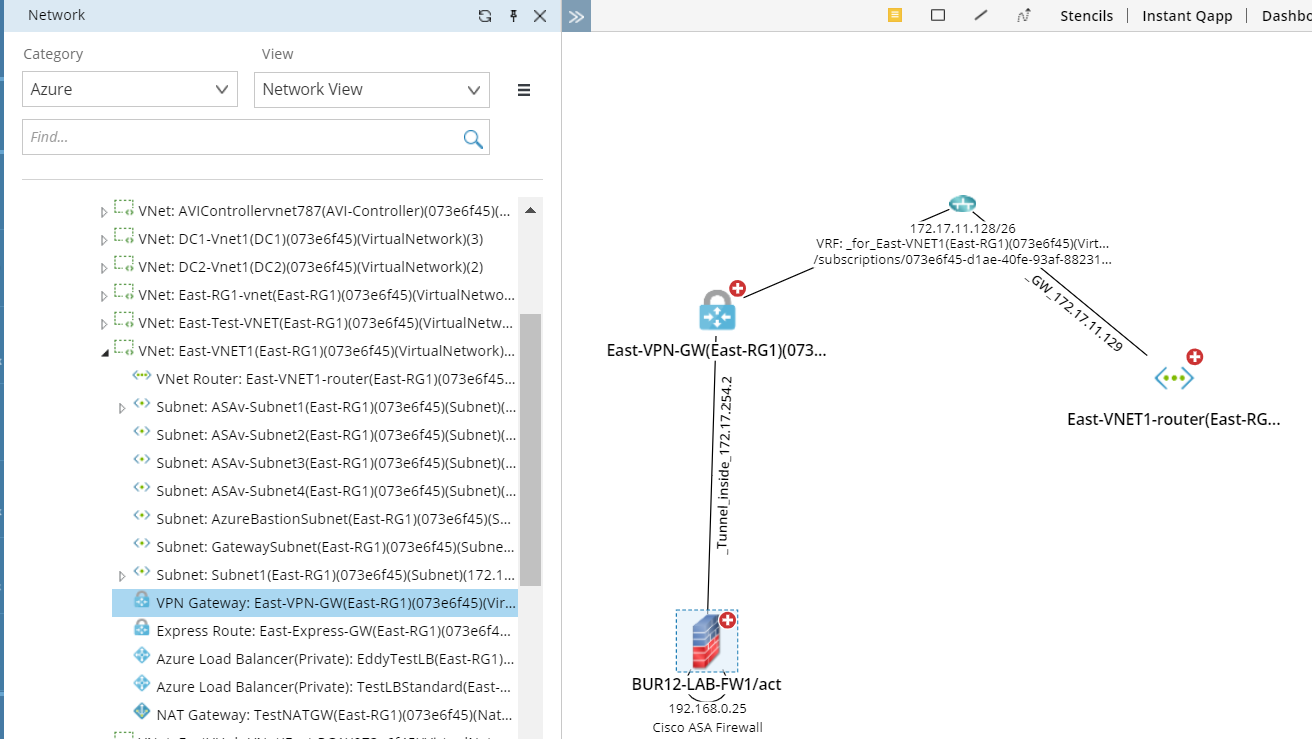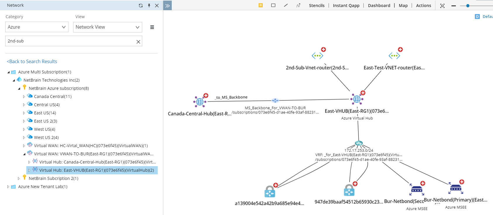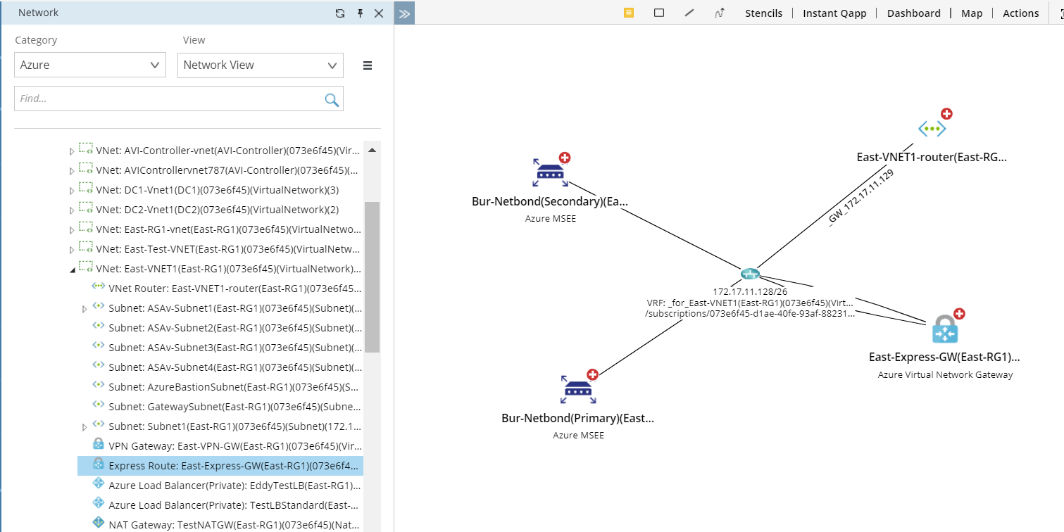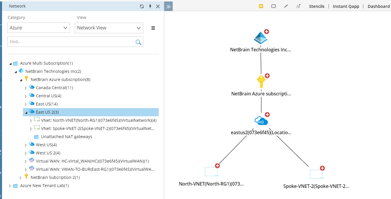 - In the Network pane, select Azure > Network View. The hierarchy view of the Azure data model is organized in this order: Tenant > Subscription > Region > VNet.
