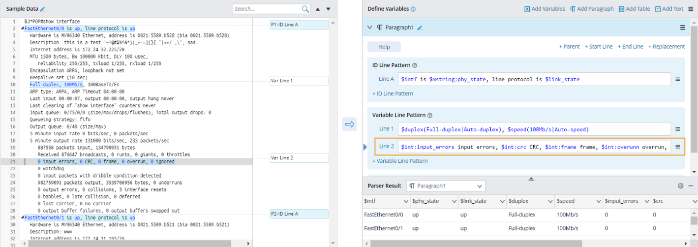 For example, to parse metrics like input errors, CRC errors, etc., for each interface of which the MTU’s value is 1500 bytes, you can define “$int:input_err input errors, $int:crc CRC, $int:frame frame, $int:overrun overrun” as the Variable Line Pattern.