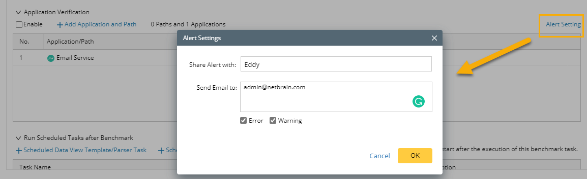 - Click Alert Setting to define system and email alerts for path changes or failures. The system will send alerts to specified users if the paths fail or change compared with Golden Path or the last verified result.