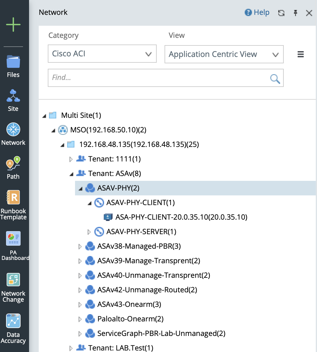 The application-centric view allows you to see different tenants and the applications deployed under each. The ACI data model is organized as Tenant > Application Profile > EPG > Endpoint. In the Network pane, you can view the applications deployed over an ACI Fabric and the application structure.