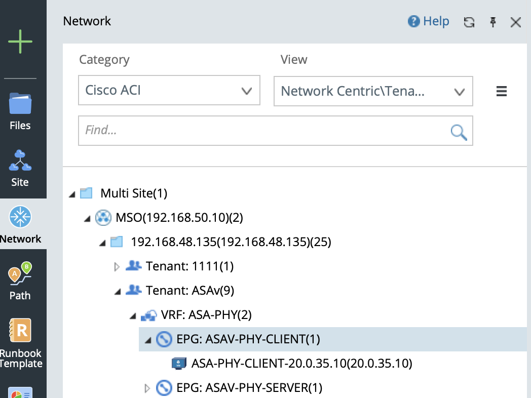 - In the View field, select Network Centric View > Tenant View. The ACI data model in NetBrain is organized in this order: Multi Site Folder > MSO (Multi Site Orchestrator) > APIC Domain > Tenant > VRF > EPG (Endpoint Group) > Endpoint.