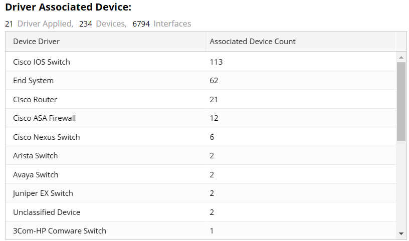 The following table displays the count of devices discovered by corresponding drivers. The device driver defines the method of retrieving and parsing device data during live access.