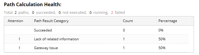 This area shows the summary of path calculation, such as the count of total paths, the count of successfully calculated paths, and the count of not calculated paths. The Path Result Category column is categorized by Succeeded and the causes of failure.
