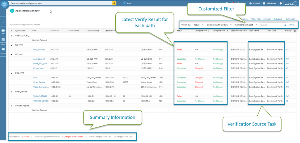 AAM can periodically monitor or verify the application paths and send alerts and emails when paths change. Application paths can be added to a benchmark task so it will be verified when the task is executed. Verification results can be viewed in Application Manager, exported to a CSV file or on a map depicting the differences between the current path and Golden Path.