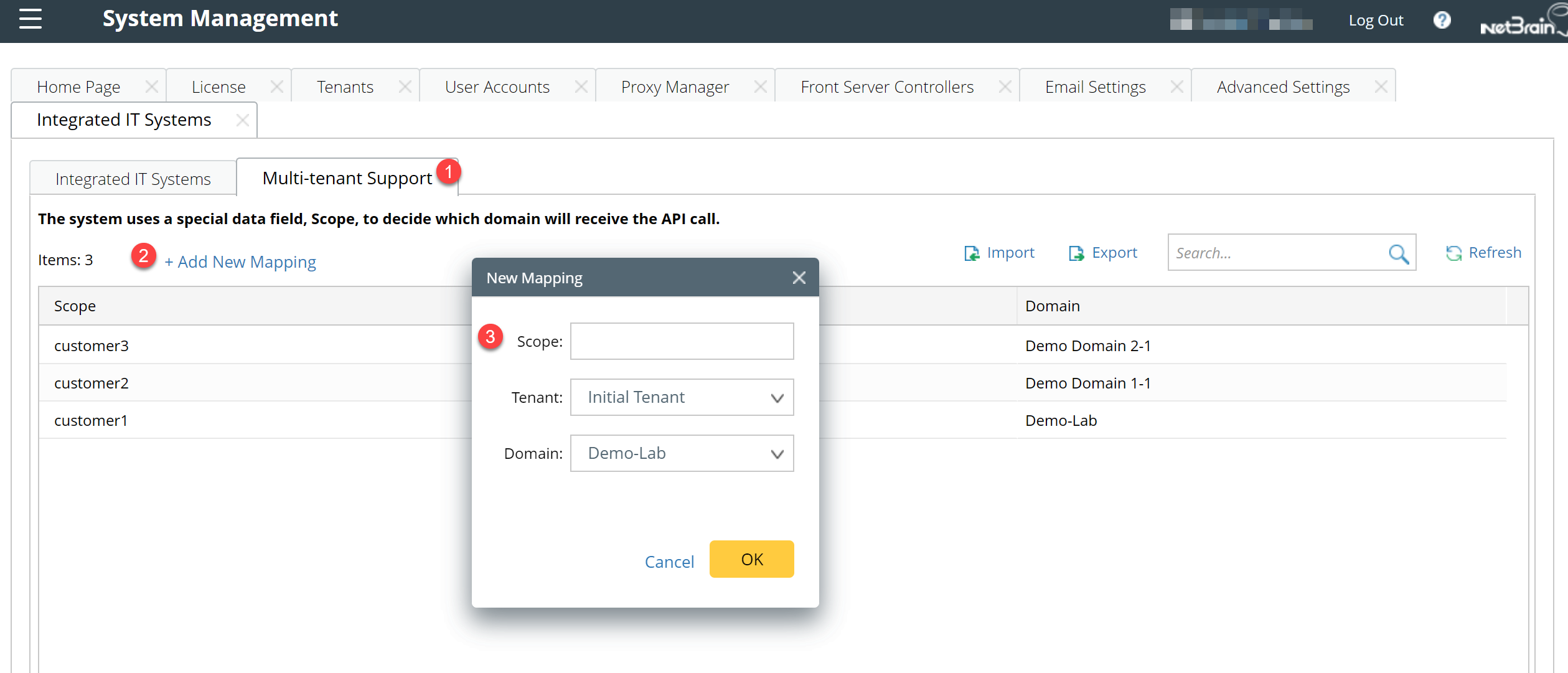 - In the New Mapping window, enter the Scope name and select the corresponding tenant and domain.