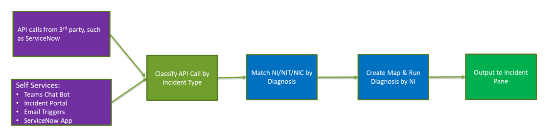 Triggered Automation Framework (TAF) provides powerful triggered diagnosis by executing Network Intent automatically for incoming tickets. There are two ways to trigger the diagnosis: an external ticket from the 3rd party system (an API call from the machine to machine) and a self-serviced call from Teams Chat Bot, Emails, ServiceNow App, and Incident Portal (an API call from human to machine). For both types of trigger, TAF matches it with suitable NI based on pre-defined criteria to perform triggered diagnosis. The results are displayed in the Incident Pane.