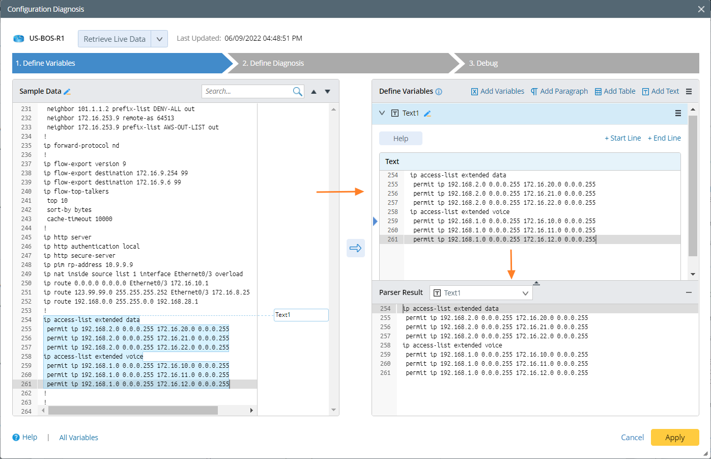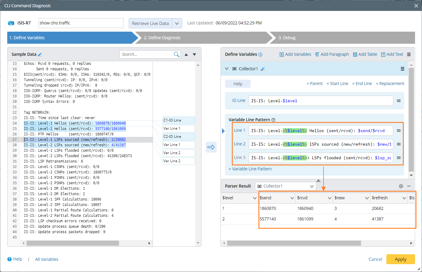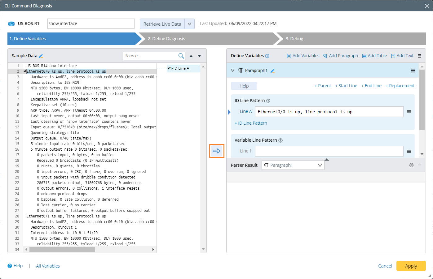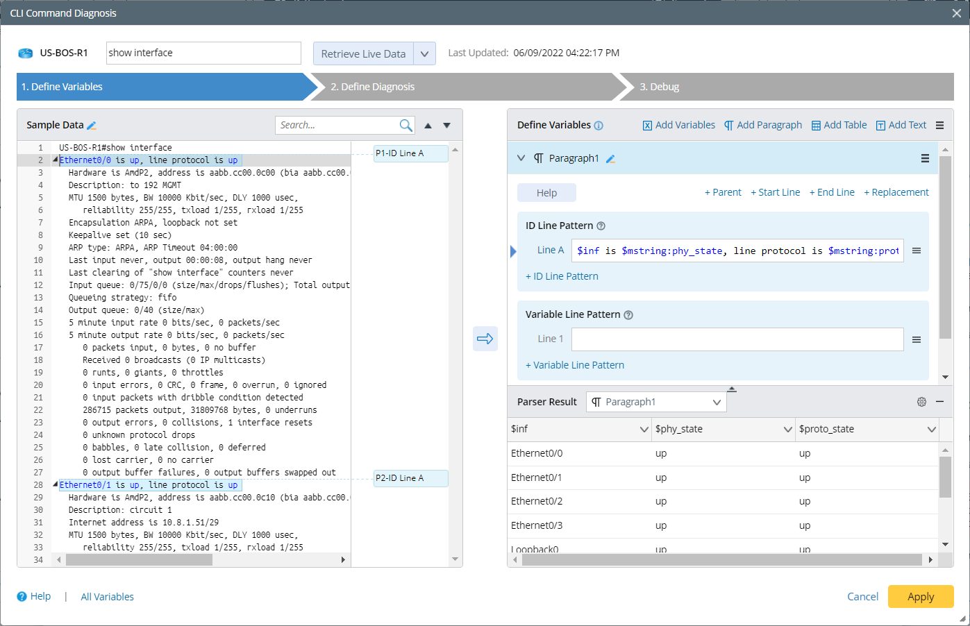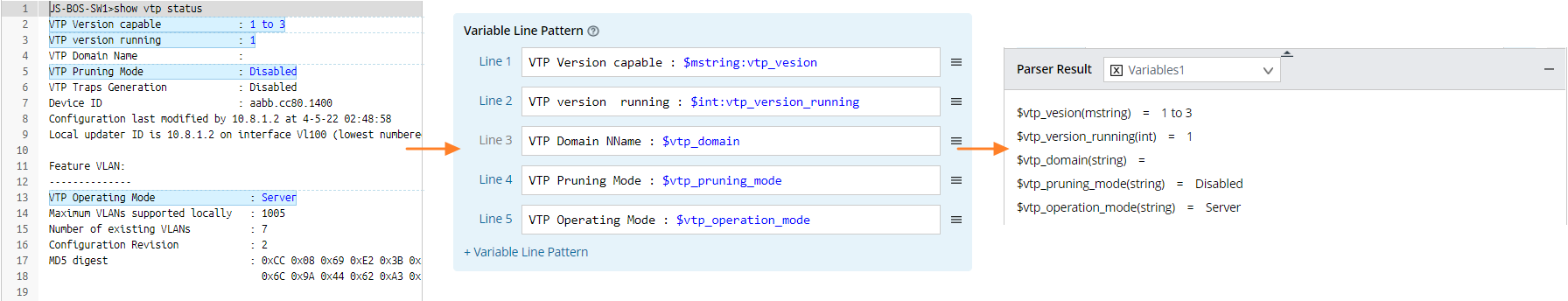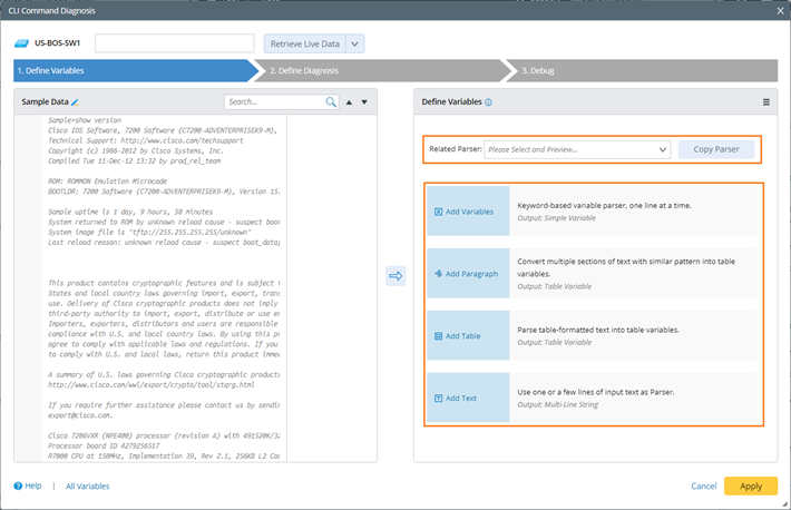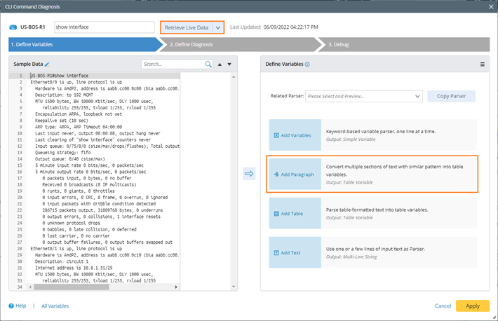 Add Parser from the Config and CLI command and define the variables via Visual Parser. Visual Parser supports five types of variable definitions: Variable, Paragraph, Table, Text, and Collector. See Visual Parser for more details.