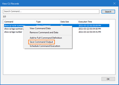 - In the View CLI Records dialog, right-click the target command and click Save Command Output.
