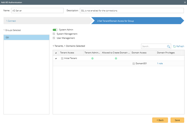 icon and select Add AD Authentication from the drop-down list. A wizard is opened to guide you through the steps to connect to the AD server and configure the tenant or domain access privileges for the imported user accounts.