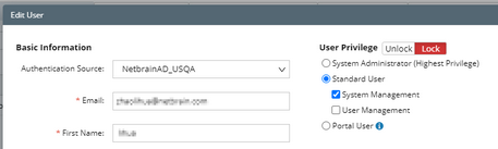 Note: To prevent the assigned roles and privileges of an external user account from being synced with any changed authentication settings, you can lock the user rights as follows. See Creating User Account for more details.