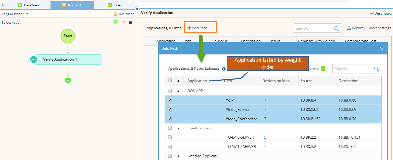 When you select paths to add them to the Verify Application node of a runbook, the applications will be listed and sorted by weight from high to low.
