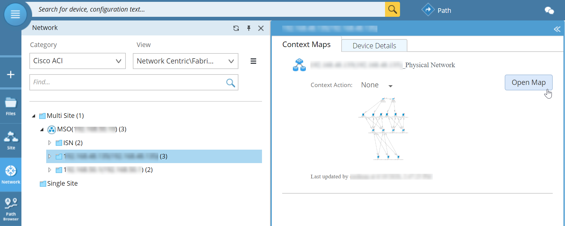 After discovering your ACI network, you can visualize the network data on a map, including topology, IP address, and configurations. Besides, you can apply a data view template to visualize more information on the map.