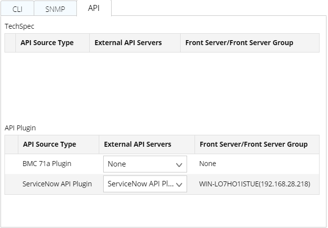Used to specify the API server to retrieve device data from an external API server. Note: The external API servers must be predefined in the API Server Manager. If a Front Server is specified when defining the API server, the system will use the specified Front Server to access the external API server. See Adding an API Server for more details. Note: The Cisco ACI or VMware ESXi source types in the TechSpec area are only available for the devices in Cisco ACI or VMware ESXi networks, and their external API servers cannot be manually specified. |