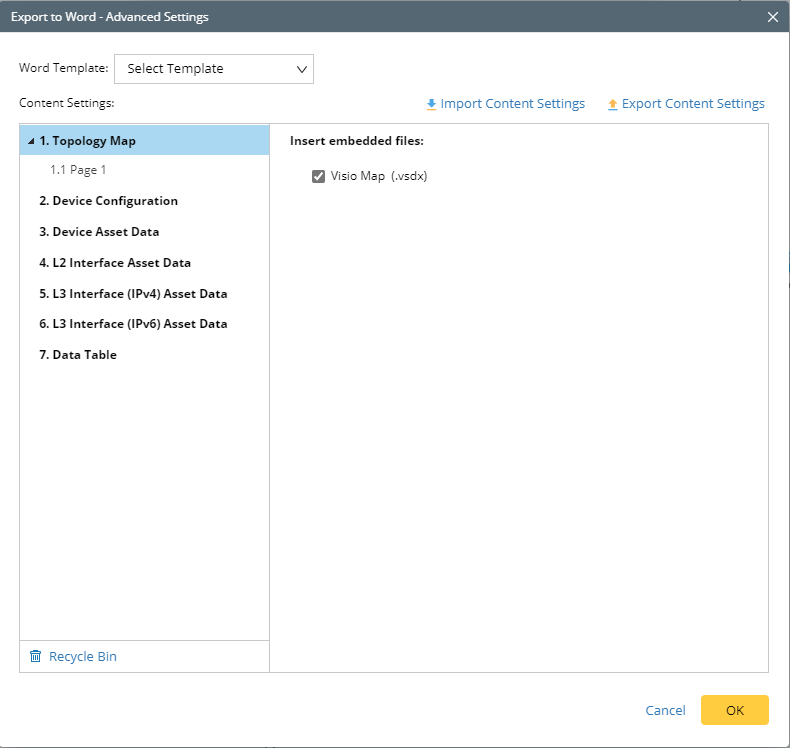 Content Settings determine what contents are included in the exported document from a map. The left side of the setting pane reflects the table of the content of the document, which can be renamed, moved up/down, and removed. The right side reflects the text of the document.