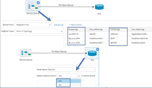If a row in the Device Queue node has multiple device columns, you need to add different device nodes. For example, if you build devices in the Neighbor Pair pattern in the Device Queue node, you need to define two device nodes, with one node to execute a CLI command on this device, and the other one to execute a CLI command on this device’s neighbor.
