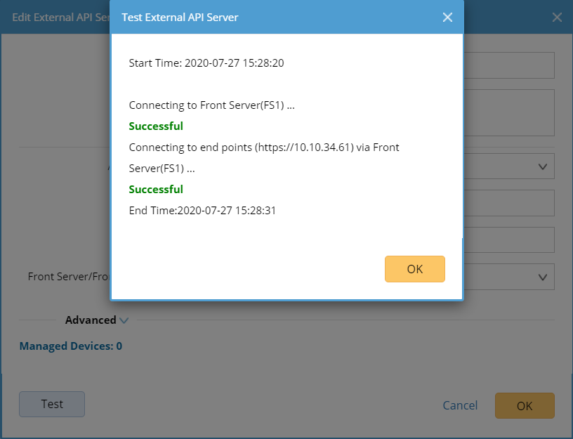 6)Click Test to check the connectivity between your NetBrain Front Server and Checkpoint Management Domain.