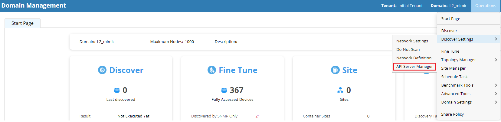 1.In the Domain Management page, select Operations > Discover Settings > API Server Manager from the quick access toolbar.