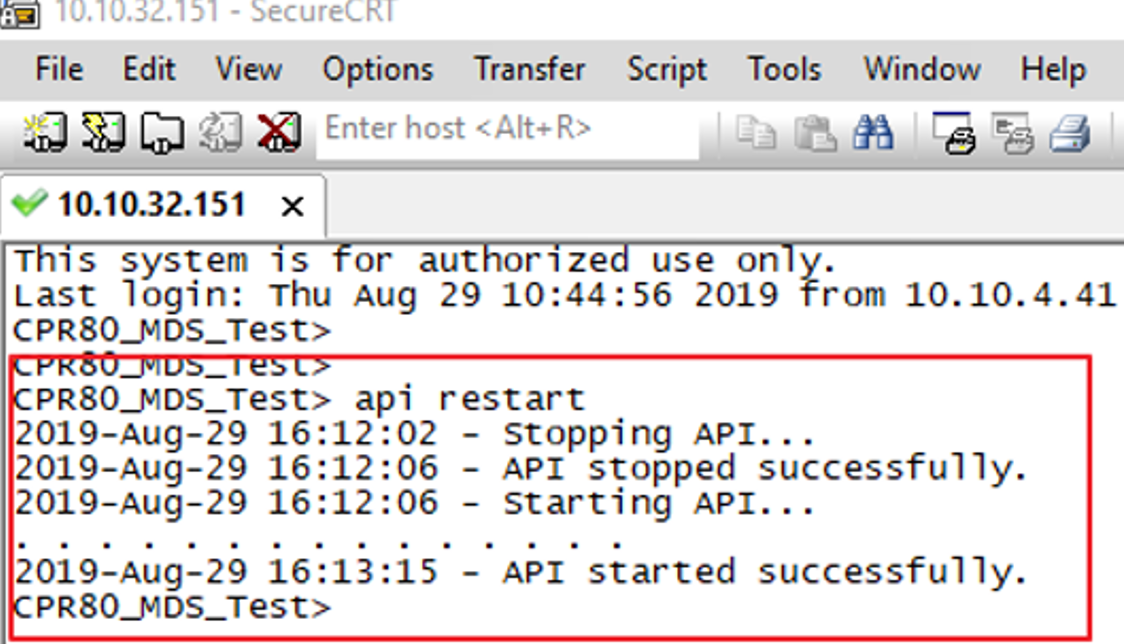 3.Log in to Smart Dashboard via SSH by using an SSH/Telnet tool and execute the api restart command to activate the API access permission.