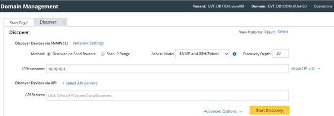 A seed router is the starting point where the discovery begins. With the seed router method, all the discovered neighbor devices will be treated as new seeds, until all devices matching the defined Discovery Depths are discovered. The system enables you to discover all the neighbor devices from the route tables, NDP tables, and SNMP routing protocol neighbors.