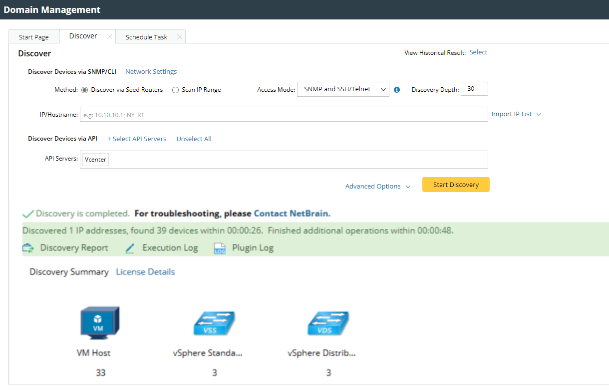 Note: The SDN discovery only retrieves basic data of your network and builds L3 topology. After the discovery, you need to execute a benchmark task to retrieve all data and build all components, including visual spaces and data views. See Auto-Updating vCenter Data in NetBrain through Benchmark for details.