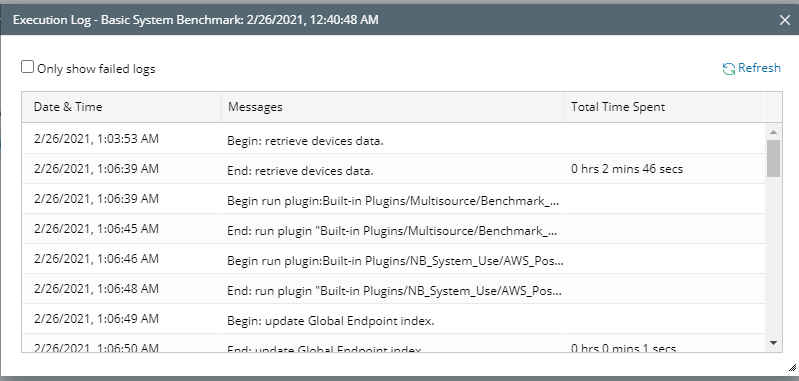 Tip: You can view the latest execution result of all benchmark tasks from the Last Result column. To view the detailed latest execution log of a benchmark task, click the hyperlink (such as Succeeded) in its Last Result column.