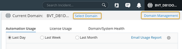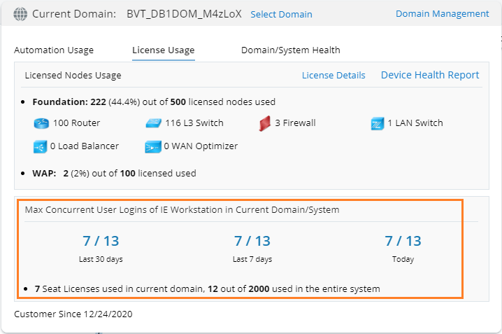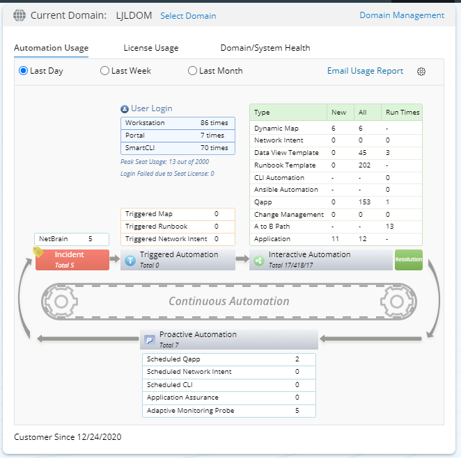 ▪Automation Usage — Get to see the parameters of user login, triggered automation, interactive automation, proactive automation and incident-based collaboration activities. You can click Email Usage Report to configure the email settings to get reports as required. ▪License Usage — Get to know the licensed node count and consumed node count by device type, as well as the licensed seat count. You can view the report about the max concurrent user logins for today, the last 7 days, and the last 30 days at the domain and system-level separately. Note: SDN licensed ports and CPU processors require additional purchase. ▪Domain/ System Health — Monitor NetBrain servers and services. It is available only when Service Monitor Agent is installed. See Monitoring Servers and Services for more details. |