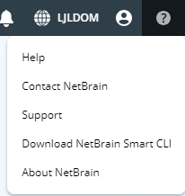 ▪Help — visit online help. ▪Contact NetBrain — reach out to Netbrain Support Team for help. ▪Support — redirect to NetBrain Website for further support. ▪Download NetBrain Smart CLI — click to download the Smart CLI tool. ▪About NetBrain — view version number and legal notice. |