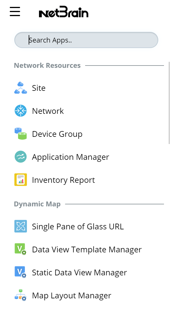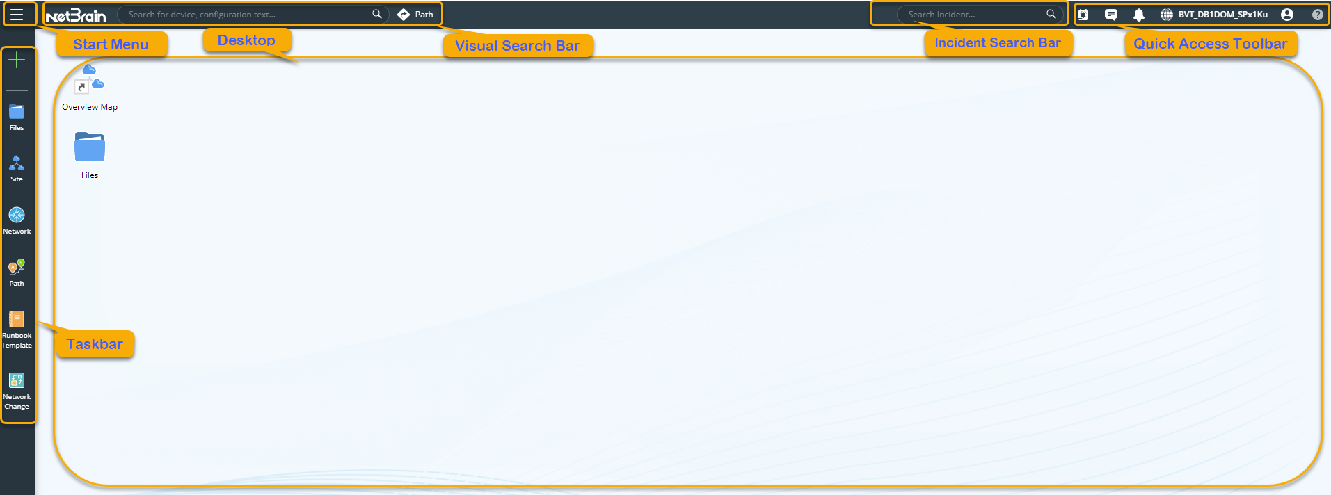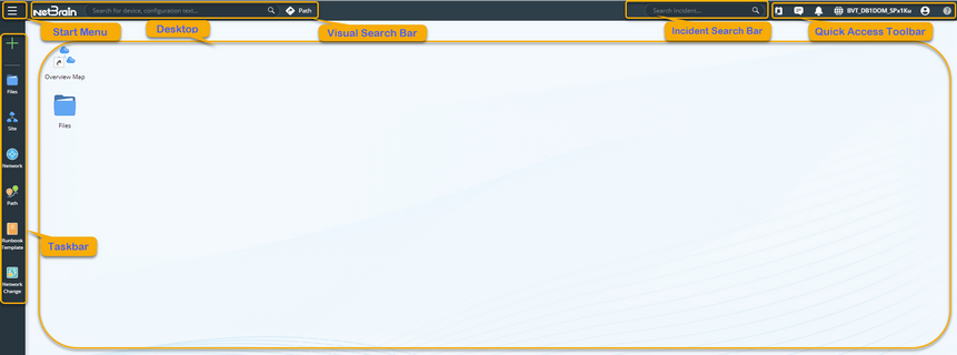 icon on the top of the taskbar, and then you can access the main NetBrain functions. The start menu opens as follows: