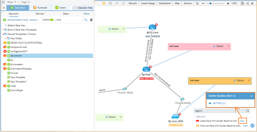 ▪This data view has Golden Baseline Alerts for X device/interface variables, detected in the latest run. ▪This data view has Golden Baseline Alerts for Y device/interface variables, detected in the last six months. ▪X + Y = 6 |