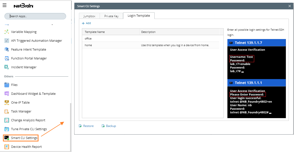 The system provides independent Smart CLI Settings and Smart CLI Login for Smart CLI. When you integrate the Smart CLI with your NetBrain IE, the Smart CLI will use the predefined credentials in Smart CLI Settings and Smart CLI Login to access devices.
