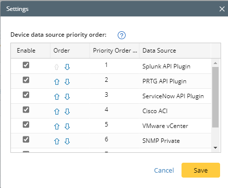 Tip: Customized data sources have higher priority over built-in ones. The predefined priority defaults to: API (third-party) > API (SDN controller) > SNMP Private > SNMP Public > CLI (+Config). With the predefined or customized priority, the system will check detailed device settings in order. If the required setting is not configured, for example, API Server or SNMP RO is not in place, then it will go for the next data source.