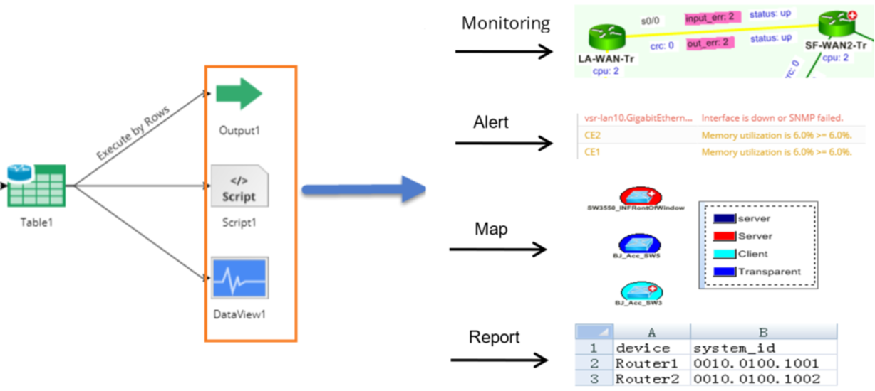 The Output node is used to analyze the variables from the upstream Table node and to visualize the analysis results to users in different manners, such as message, alerts, CSV, device/interface highlight and adding notes.