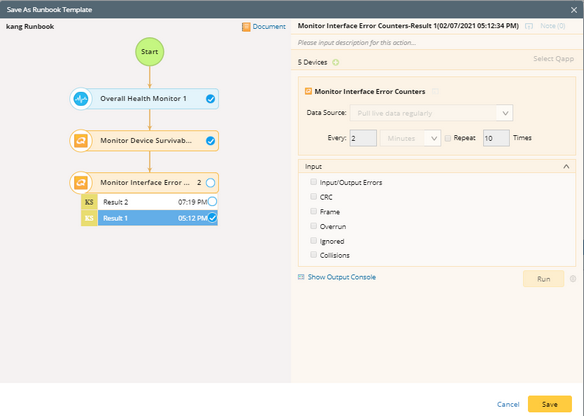 To share knowledge with junior users, you can save a golden runbook as a runbook template. When saving a runbook to a template, you can select which result to be saved. Only the selected action results of the action nodes will be saved to the template as the inputs. The target devices and execution results of these action nodes will be discarded.