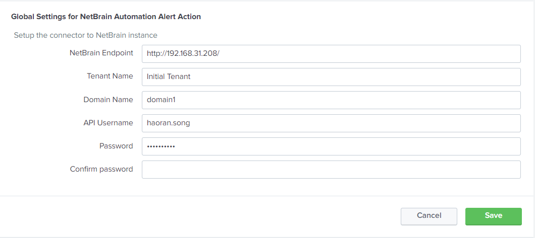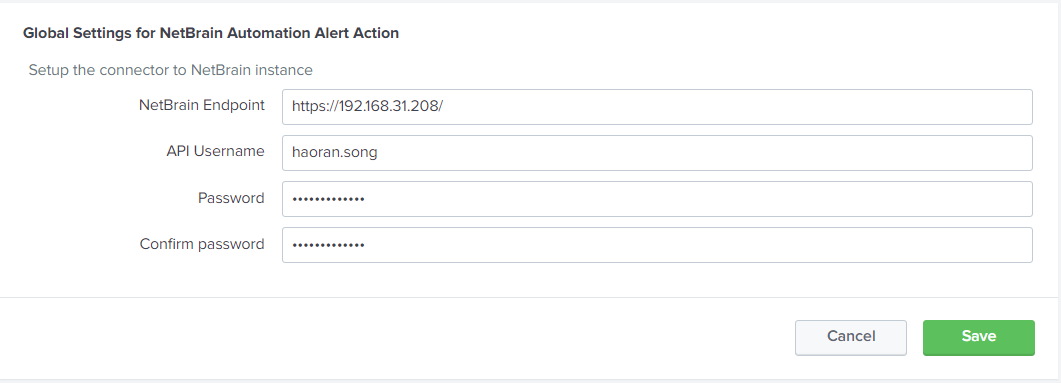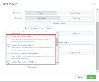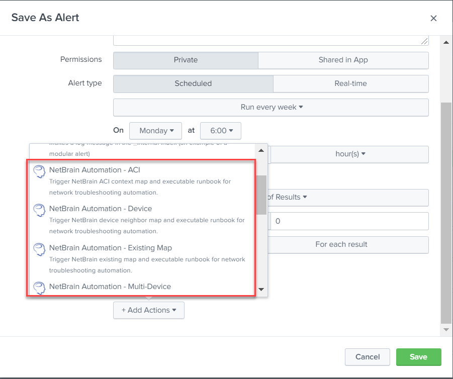 After the Splunk App setup is installed, you can select NetBrain alert action to define how to create map and execute Runbook Template when Splunk generates alert. NetBrain provides the following alert actions: