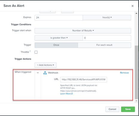 Webhook alert action is used to define the Webhook URL to create NetBrain map and execute Runbook Template when Splunk alert is generated. The following screenshot exemplifies the Save As Alert interface in Splunk App.