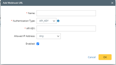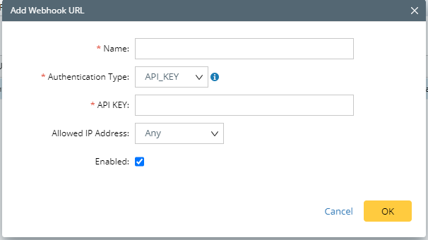 4.Complete the required fields (Name/Authentication Type/API KEY) and select Enabled check-box.