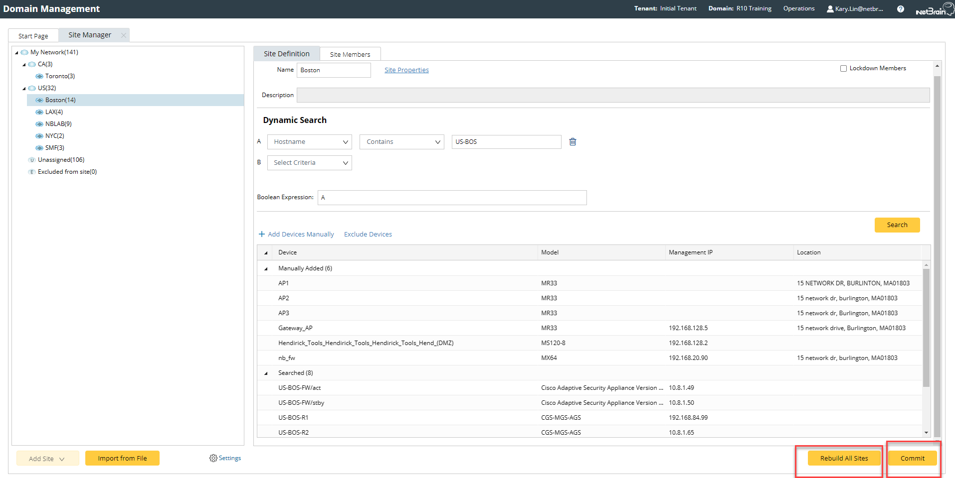 5.In the Site Manager, click Rebuild All Sites to rebuild the site topology. The Site Member pane opens automatically and lists the devices in the current site.